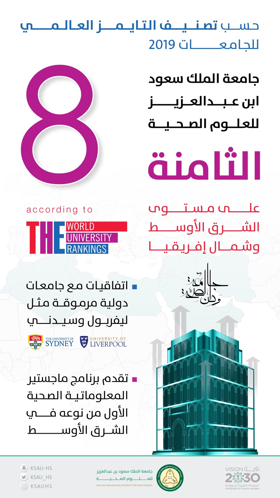 جامعة الملك سعود بن عبدالعزيز للعلوم الصحية On Twitter الجامعة بالمركز الثامن عربيا في تصنيف التايمز للتعليم العالي Https T Co Flbftbwbil جامعة لصحة وطن Ksauhs